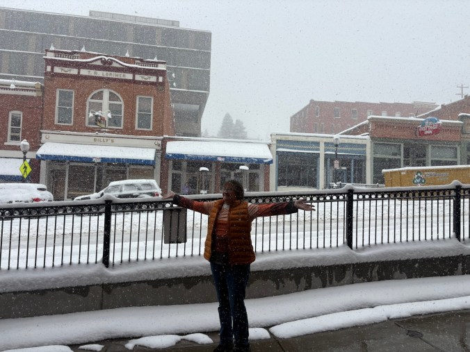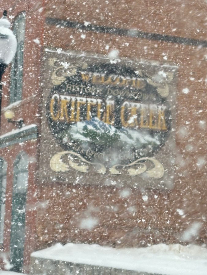 It was a beautiful, snowy morning and we got to live our dream of being snowed in in the mountains. Of course, we weren’t leaving for two more days, so we weren’t stranded, and several cars did plow through the winding mountain roads to get their Cripple Creek fix, but we only plowed through a few snowy streets to get downtown to the action.
