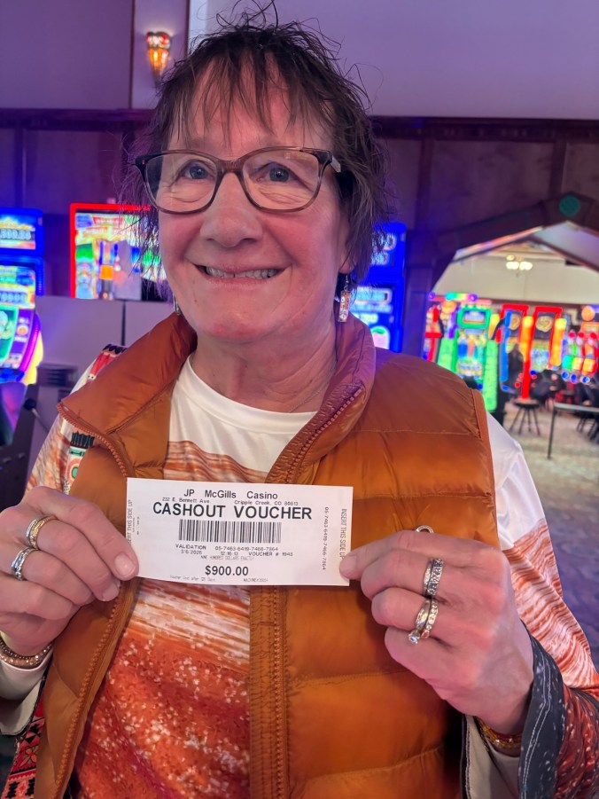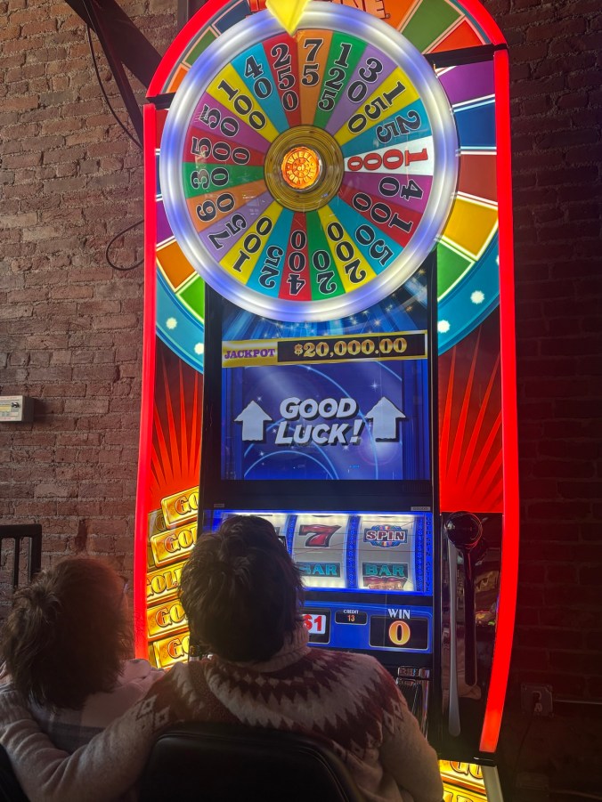 Our ritual of singing along with John Denver to Rocky Mountain High on the last stretch of mountainous road was fulfilled once again. And, Gail always has to give the Wheel of Fortune machine a spin. She walked away with a little cash, which she normally does.
