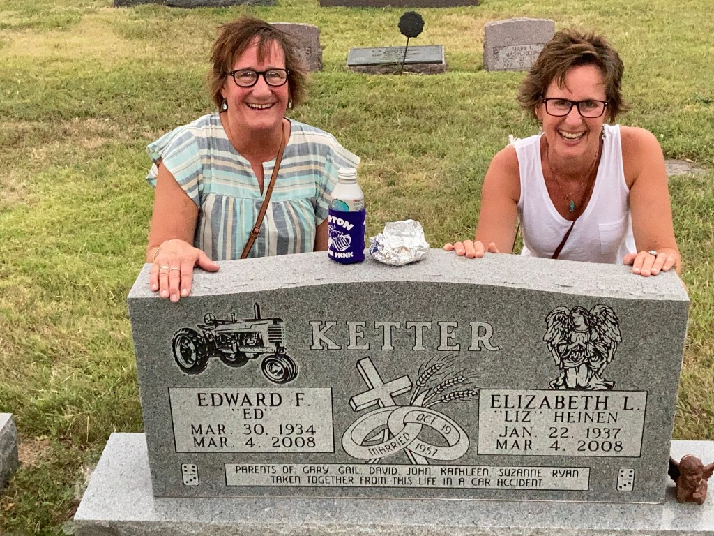 Suzanne had made a visit earlier in the day, so Gail and I strolled down to the cemetery to bring our parents their annual church picnic burger and beer. They didn’t say so, but we know they appreciated it.