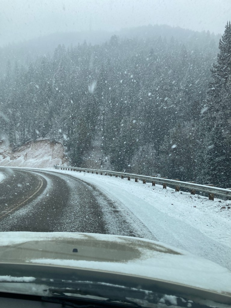 *The weather was much better for our trip out than it was last year. As last year’s picture shows, we drove–and miraculously arrived–through a mountain snowstorm.