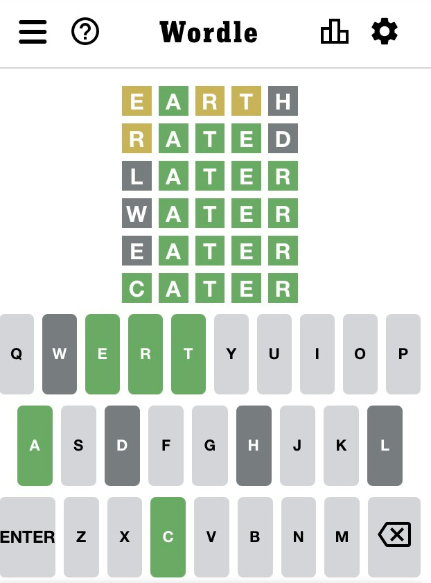 Cater took me six guesses too. Fun daily brain exercise. Yesterday my neighbor poster her quordle results. Yes, solving four words, and it’s fun too.