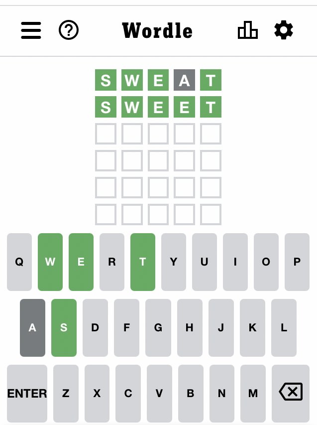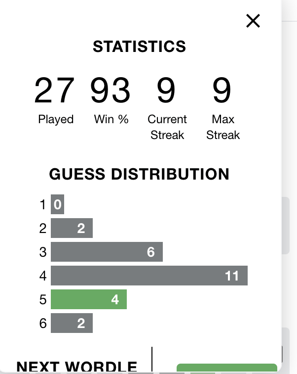 As of today, I have played 27 games, and have solved all but two. Most days, it requires four attempts for me, but I have got it in as little as two, and as many as six. When it is solved, I feel a rush; a heady thrill, but for just a moment. Then, I realize I have to wait 24 hours for another one.