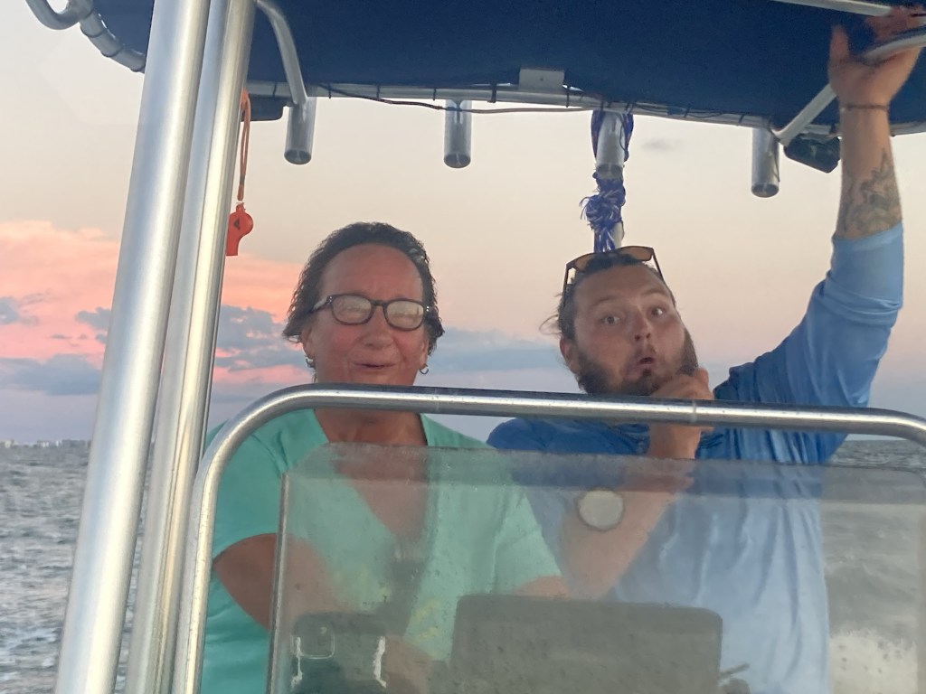 Captain Ron played right along, in control the entire time. He is the son of her daughter Abby’s boyfriend, so we had that connection. He left northern Michigan where Abby and his dad live for warmer weather. He lives in Fort Myers and captains his boat in the bay and the Gulf there, a short jaunt south of St. Pete, where we stayed. He took us on an unforgettable sunset cruise.
