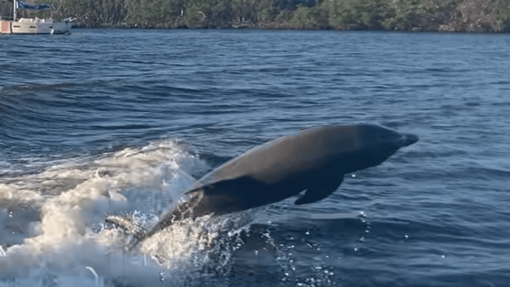 He knew just how to coax the playful dolphins out of the water in the wake behind his boat, and we were treated to this magnificent sight: