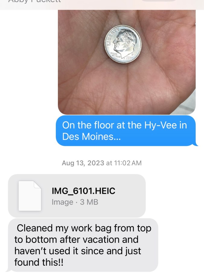 It seems these dimes are Mom and Dad’s preferred method of communication to me, but not as much for Gail and Suzanne. Gail says she finds a few dimes–more than any other coin–on the floor of the grill/bar she manages, but that’s the extent of it for her. No major dime finds for Suzanne.