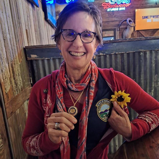 There are a few highlights in January, however. Our dear Mom’s birthday was in January, and now my dear daughter-in-law celebrates hers on the same day with us. And, of course, our home state of Kansas celebrates its birthday on January 29th. This year it was 165 years old. I do my best to commemorate this special day in my fullest regalia. (Please note the sunflower earrings as well.)