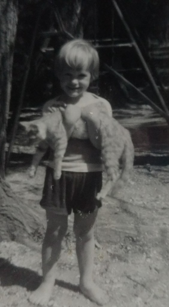 I remember that Suzanne had a favorite farm cat she named Ashley. I also remember that she dressed her up in doll clothes. Suzanne doesn’t have a cat now, but she says she would like one again someday. When she lived in Osborne near our parents, she had Donnie and Salem. When Gail’s kids were younger, they had a housecat: Bojangles. When they found out Bojangles was female, she became Belle Jingles. She hasn’t had a cat since, but hasn’t ruled out another one someday.