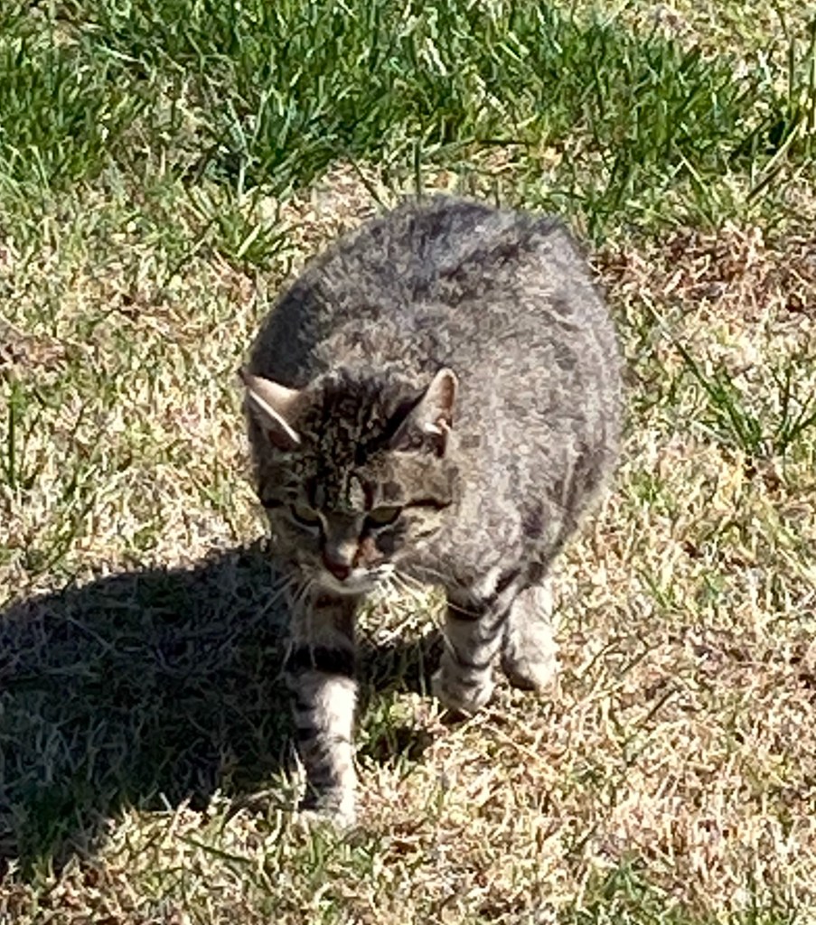 In January, a gray tiger-striped cat showed up at our back door. I didn’t see it; I heard it. My head was in the refrigerator, and at the very same moment I was smelling the milk to determine that it was indeed a few days sour, I heard the meowing at the back door.