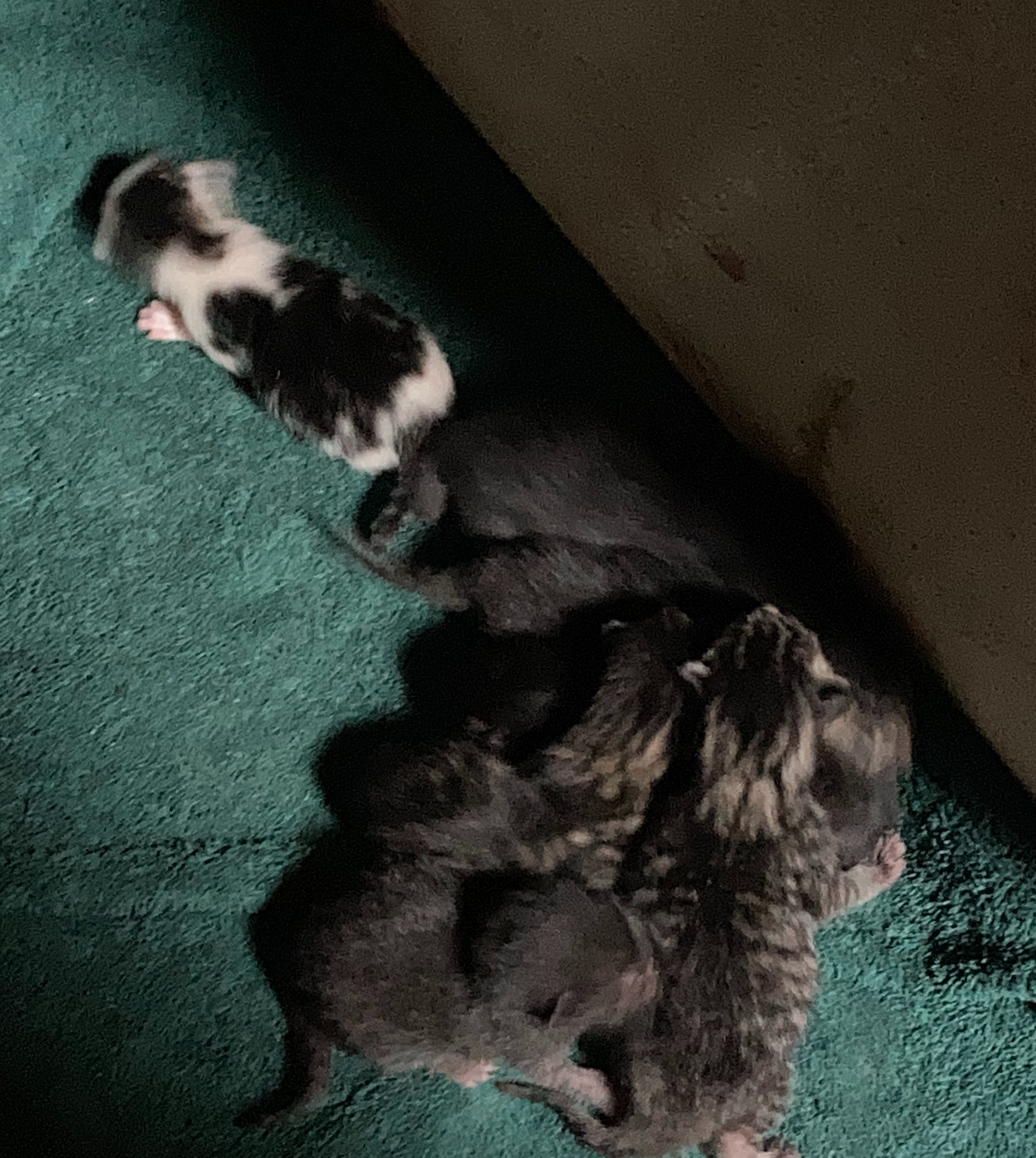When they got up for a 3 a.m. feeding, there were five kittens in the box, and no mama cat. They searched the house for about half an hour, but no luck. Knowing they were somewhere in their house, and the other kittens were fed and quiet, they went back to bed. In the morning, he found Mama and the two biggest kittens hiding in the back of his closet. She had apparently separated them from the smaller kittens, likely instinctively knowing that the bigger ones may compromise the smaller one’s ability to get enough milk. She knew what she was doing. He put them all back together, and she separated them again.