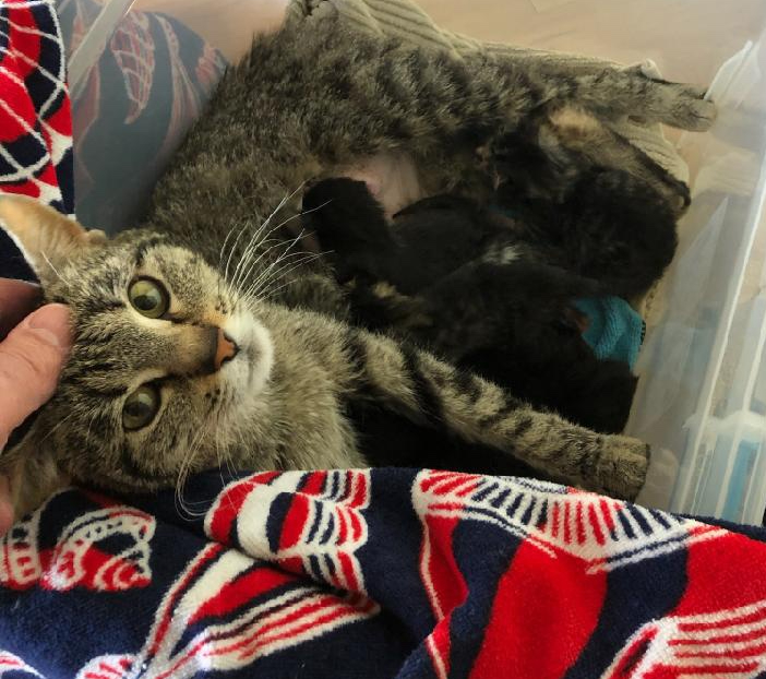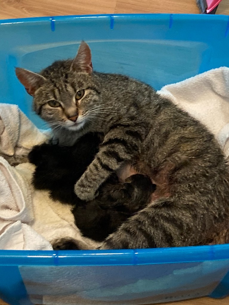 The mother’s post-birth complications are detailed in the previous blog; she rallied during her overnight stay at the vet just two days after her seven babies were born, championing the 50/50 odds the vet gave her for survival. She slid right back into the role of new mama cat; taking tender loving care of them, always looking out for their well-being and protecting them from any perceived threats.