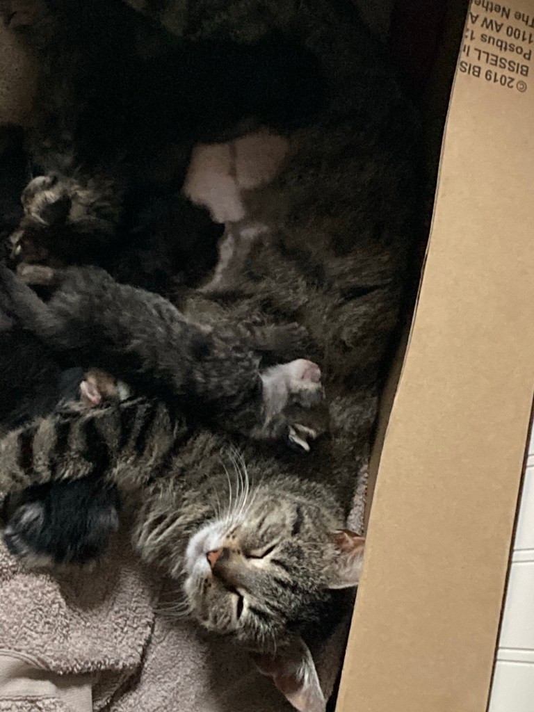 She is eating and drinking well, and producing ample milk. The kittens are contained in a cardboard box, but not for long. They will be exploring their world on their own very soon. Mama gets out and naps alone sometimes, and enjoys roaming around outside for a bit every day.