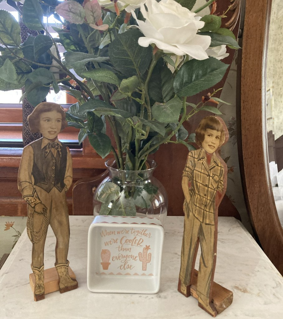 I found Bonnie and Judy at a garage sale. I knew the sale hostess, and she said they were sisters as well. If you look close at their faces, and use your imagination a bit, you can see younger versions of Gail and me. These statuettes are dated 1953 on the back.