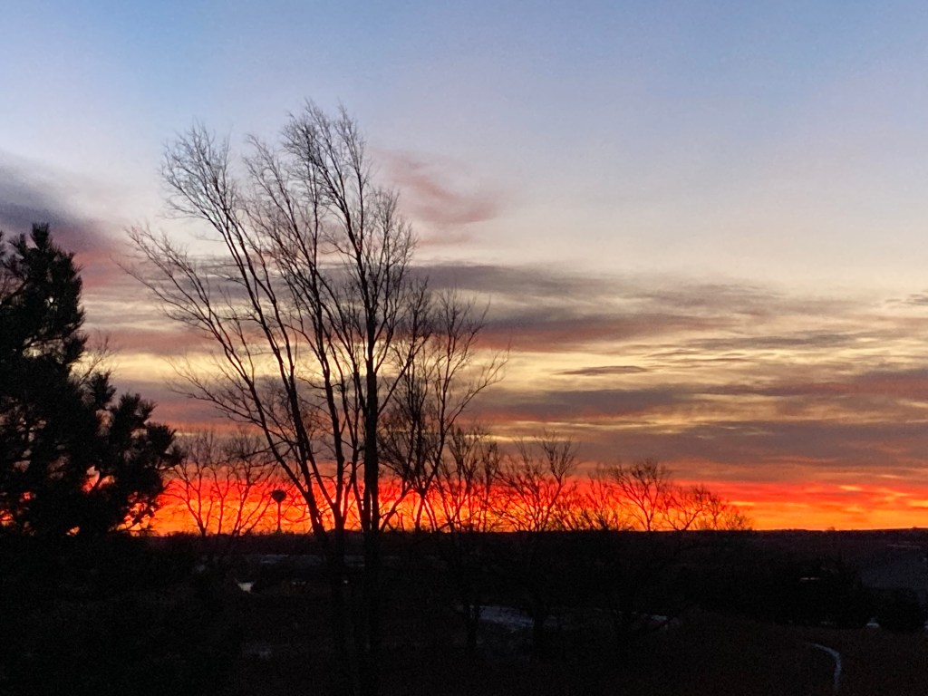 January, with all its darkness, does offer two elements of spectacular light here in Kansas: the sunrises, and the sunsets. The sunrise picture was taken from my porch last week, and the sunset picture with the Kansas grain elevator is courtesy of my friend Stacy, taken not far from our home: